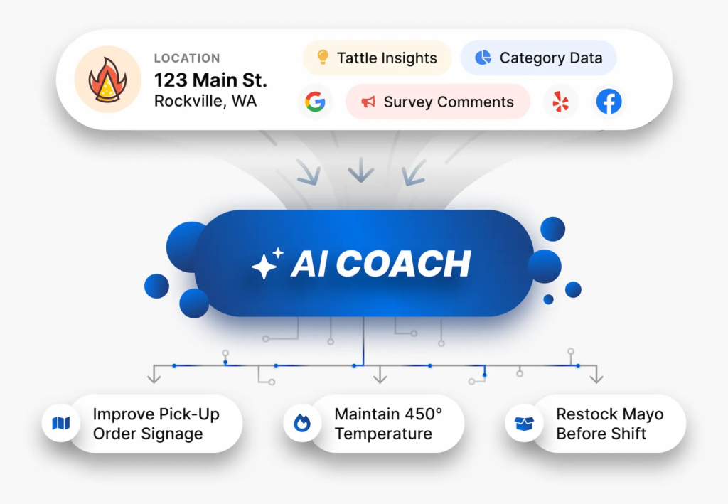 El AI Coach de Tattle funciona como un analista operativo virtual para cada local. Mientras que muchas marcas recopilan datos de sus clientes, pocas saben traducirlos eficazmente en acciones concretas para cada uno de sus establecimientos. Mediante el uso de inteligencia artificial y el análisis de millones de puntos de retroalimentación recopilados por Tattle, esta herramienta propone soluciones a la medida de cada restaurante, teniendo en cuenta factores como: