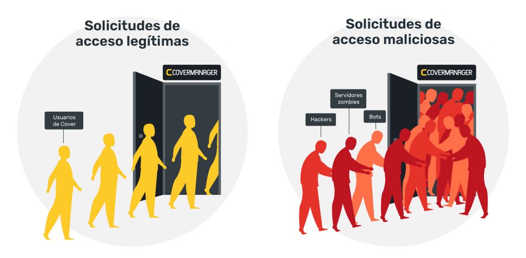 A esto se le conoce como “ataque de denegación de servicio”. Consiste en que muchos ordenadores y dispositivos infectados intentan acceder a un sistema a través de usuarios falsos, con el objetivo de impedir que los usuarios reales puedan acceder a él. Imagina que para acceder a CoverManager hay una fila ordenada de usuarios que entran a su interior (solicitudes de acceso legítimas). Cuando se produce un ataque, se dan millones de solicitudes de acceso maliciosas, bloqueando la entrada al sistema.