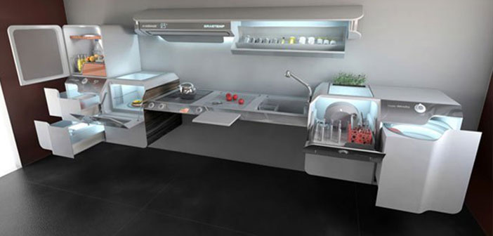 ¿Qué tienen de especial? Su encimera (con grifo y vitrocerámica incluida) que con un solo click se desliza por la pared, de tal forma que se ajusta a la altura del cocinero. Además, cuenta con un mando a distancia, que permite encender y apagar la vitrocerámica simplemente pulsándolo al igual que la campana extractora.