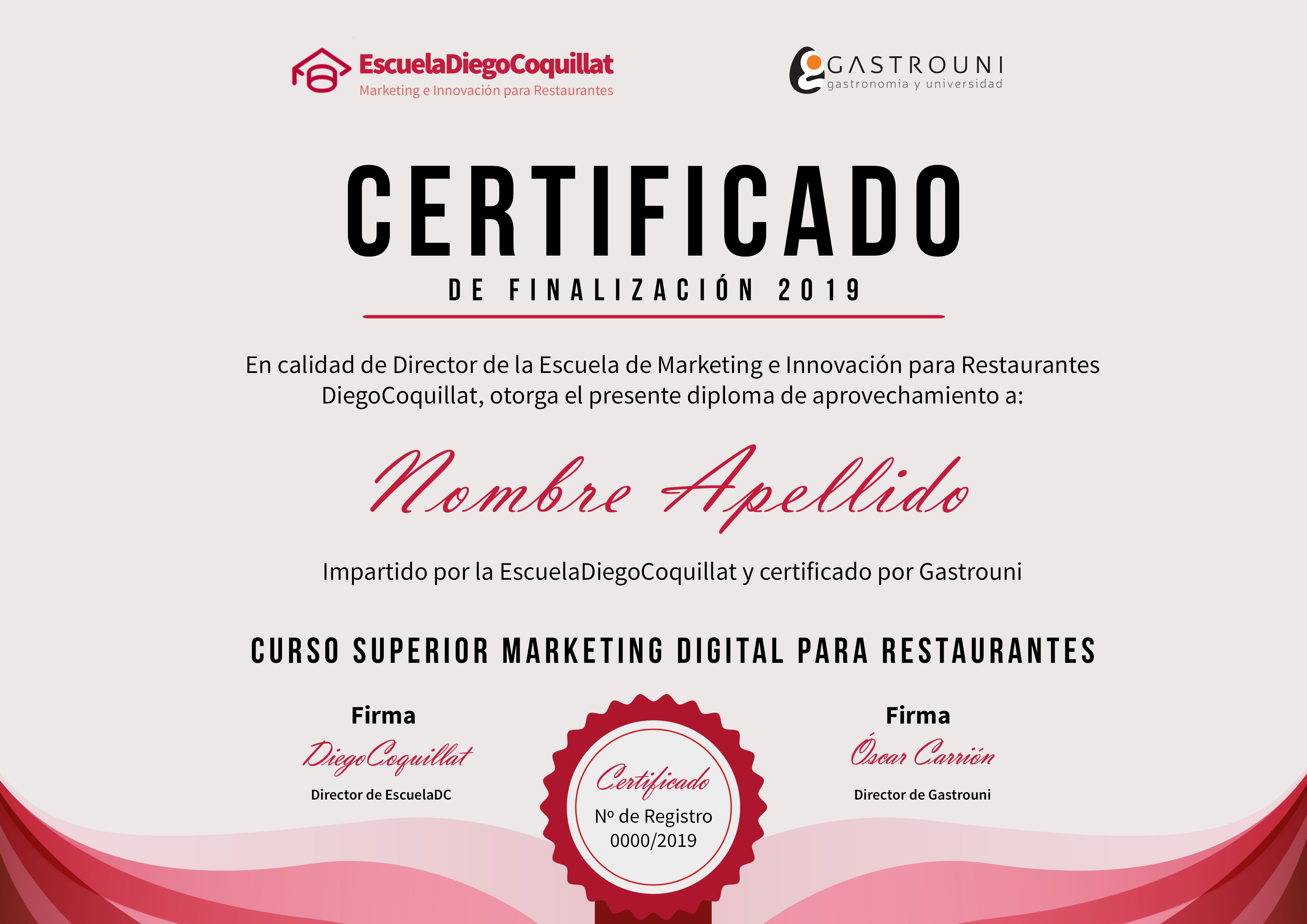 Once the course is finished, we will send you your personalized diploma that certifies the completion of the Superior Course in Digital Marketing and Innovation for Restaurants and that is issued and signed by the directors of the two entities that organize this course, the SchoolDiegoCoquillat and Gastrouni, leading entity in training in Spanish-speaking restaurant management.