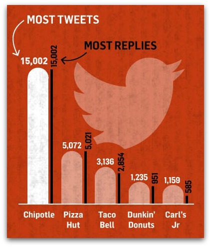 Hay una enorme diferencia entre Chipotle y el resto de cadenas en lo que se refiere a twitter, en estos momentos tiene más de 95.000 tweets emitidos, lo que supone una gran actividad dentro de esta red social y lógicamente una mayor probabilidad de obtener respuestas de sus seguidores a través de los replies.