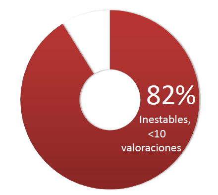 Sólo el 18% de los restaurantes son estables, con lo que el 82% de los restaurantes son inestables, tienen menos de 10 valoraciones, con lo que cualquier nueva opinión estÔ implicando un alto riesgo ya que tiene mucha influencia en la valoración final del restaurante, tanto en positivo como en negativo.