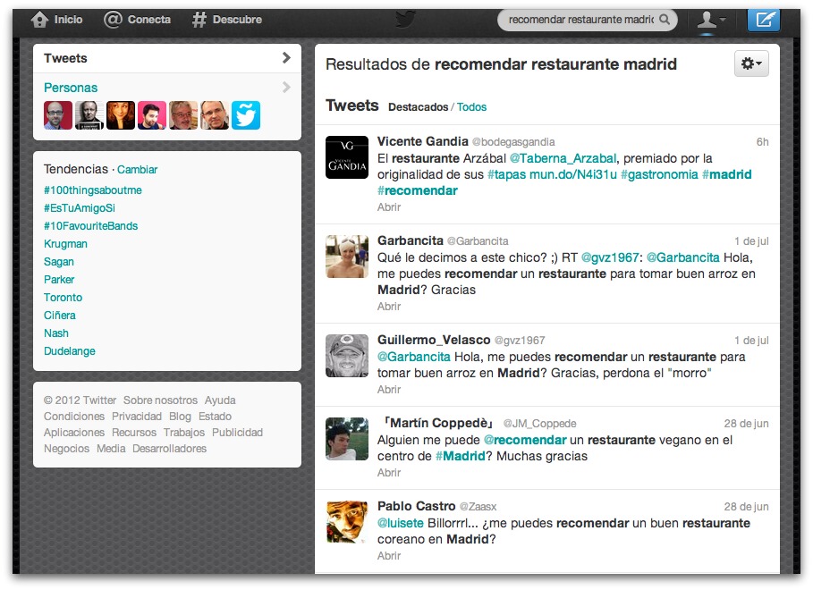 Ejemplo: Supongamos que queremos encontrar nuevos clientes que buscan restaurantes en Madrid, escribiriamos en el buscador de twitter las siguientes palabras : «recomendar restaurante madrid», y el resultado que obtendríamos lo podemos ver en esta imagen: