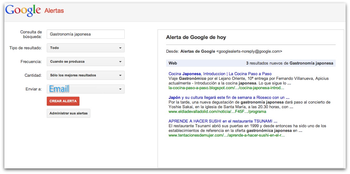 Sinceramente tengo que reconocer que es una de mis favoritas, la uso hace años, principalmente por su sencillez, te permite generar alertas que recibes en forma de correo electrónico sobre consultas de términos que son interesantes para un restaurante.