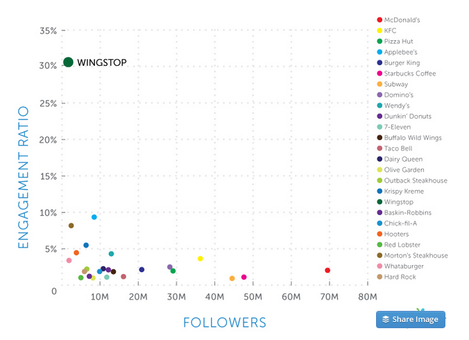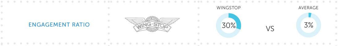 Si lo comparamos con el resto, el dato, es más sorprendente, ya que las grandes cadenas difícilmente superan el 3%, mientras que Wingstop está por encima del 30% de compromiso con sus seguidores.