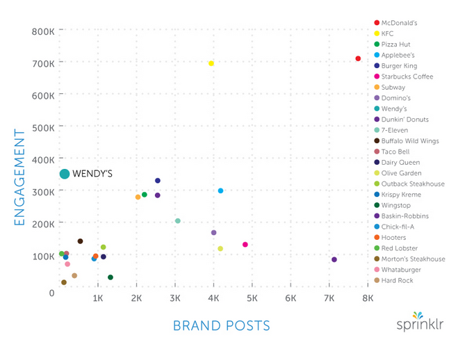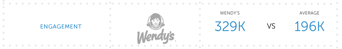 Si entendemos el engagement como una variable en base al número de compromisos (me gusta, comentarios, favoritos, retuits…) relacionado con los contenidos compartidos por la marca, la cadena de restaurantes Wendy’s, consigue un muy buen dato en este aspecto, con 329.000 interacciones a través de las diferentes redes sociales en las que participa.