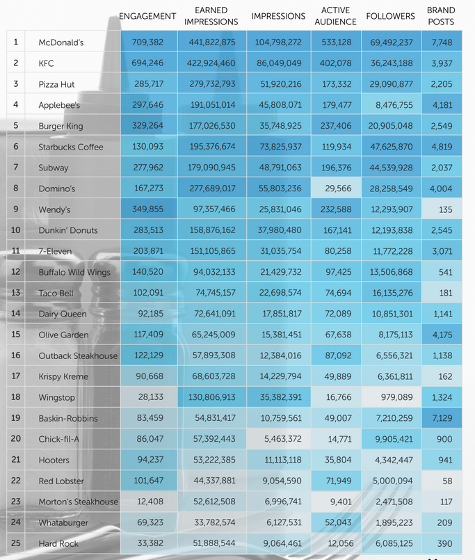 Hoy quiero compartir contigo un estudio al que he tenido acceso y que aporta elementos muy interesante sobre las 25 cadenas de restaurantes más relevantes en el mundo digital en EEUU.
