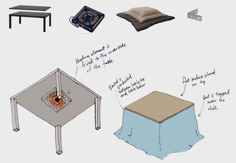 Común en Japón, casi todos los hogares tienen un Kotatsu o una mesa con calefacción. Se conoce como una forma económica de mantenerse caliente. Por lo general, la mesa Kotatsu se usa en interiores, pero se sabe que se modificó para uso en exteriores.