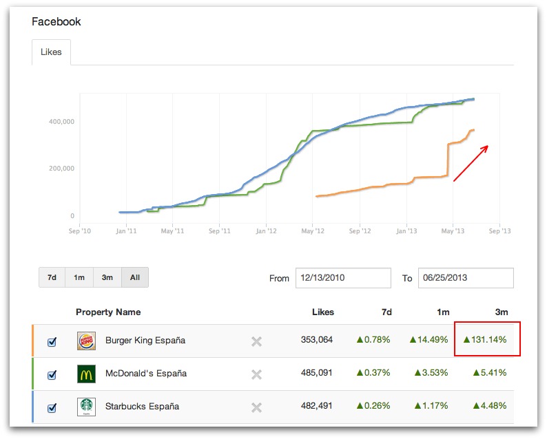 Gracias a ello he podido detectar un dato relevante que me gustaría compartir contigo, y es el incremento de la comunidad social que en su cuenta de Facebook en España está experimentando en poco más de dos meses la cadena de restaurantes Burger King.