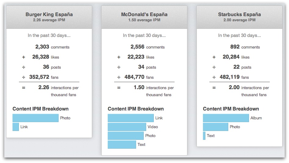 Esto se puede apreciar muy bien en los siguientes datos del último mes, donde podemos verificar como tanto la actividad en su cuenta de Facebook como su interacción con los fans es superior a la de sus competidores más directos en este periodo.