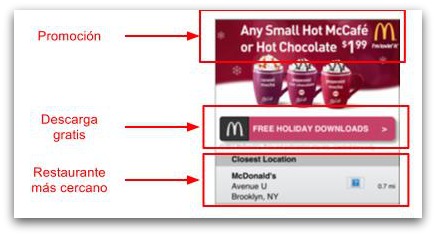Ya se ha realizado una campaña de geotargeting local por parte de McDonald’s para la promoción de sus productos de McCafé a través de la app Pandora, que es una radio online, en la cual se identificaba la ubicación de los usuarios y se publicaba un anuncio en la que se ofrecían la siguiente información :