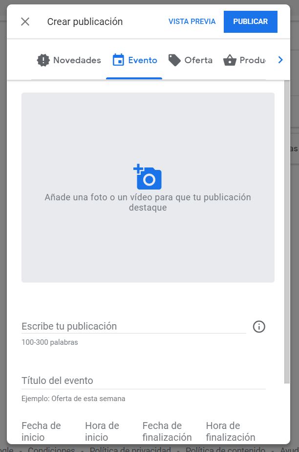 5. Se mostrarán opciones para añadir fotos, vídeos, texto, eventos, ofertas y un botón que permite acceder a la publicación. Haz clic en cada campo e introduce la información pertinente.
