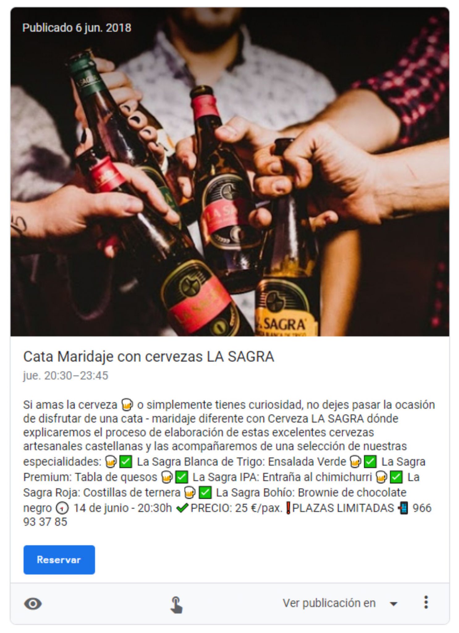 - La publicación es breve e incluye únicamente la información necesaria: «brunch especial a buen precio», «nuestras famosas torrijas». Dispones de hasta 1500 caracteres para añadir información a tu publicación, pero la longitud ideal es entre 150 y 300 caracteres.