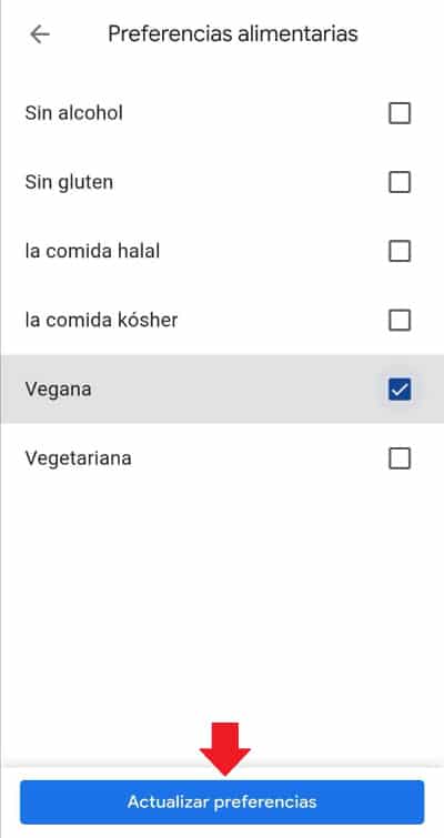 5. Selecciona tus preferencias alimentarias y haz clic en el botón de «actualizar preferencias».