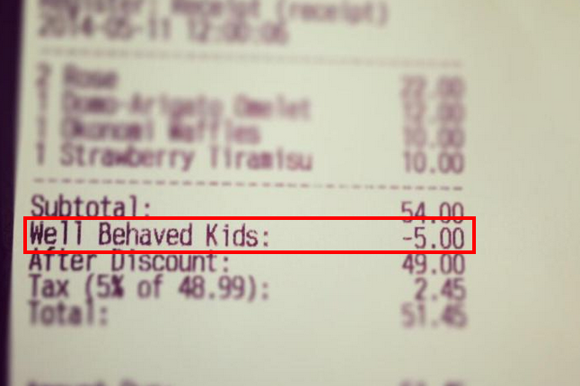 Este es el ticket que compartió la madre de una niña de un año en la red social Reddit, en la que mostraba su sorpresa por haber obtenido un descuento de 5$, premiando así el restaurante el buen comportamiento de su hija.