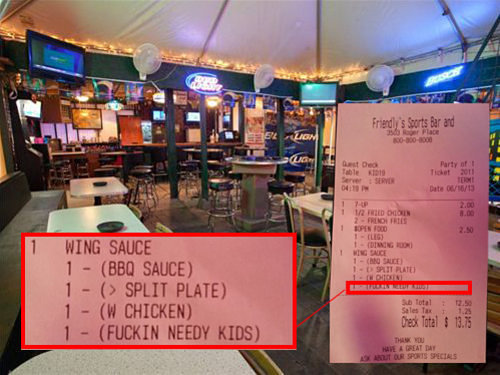 Se trata de un restaurantes de St. Louis, Friendly Sports Bar & Grill , donde al parecer el camarero incluyó en el ticket una apreciación sobre el mal comportamiento que habían tenido los niños.