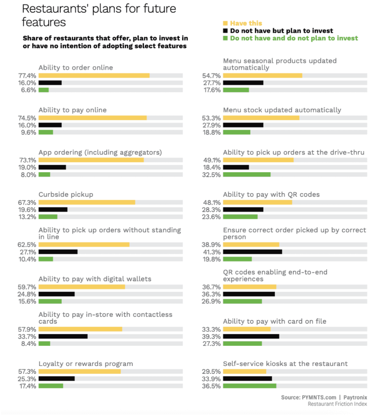 En cuanto a tecnologías específicas, los kioscos de autoservicio (36.5 %), el takeaway en los carriles de autoservicio (32.5 %), los pagos card-on-file —o tarjeta en archivo, un método por el cual el cliente autoriza transacciones inmediatas P2B a negocios particulares— (27,3 %) y pedidos gestionados íntegramente por QR (26.9 %) son las que mayor adopción experimentarán en el presente año. Por el contrario, los sistemas de detección de recogida errónea de pedidos para llevar es la que menos interesa: un 41.3 % de los restauradores participantes saben que no invertirán en ella.