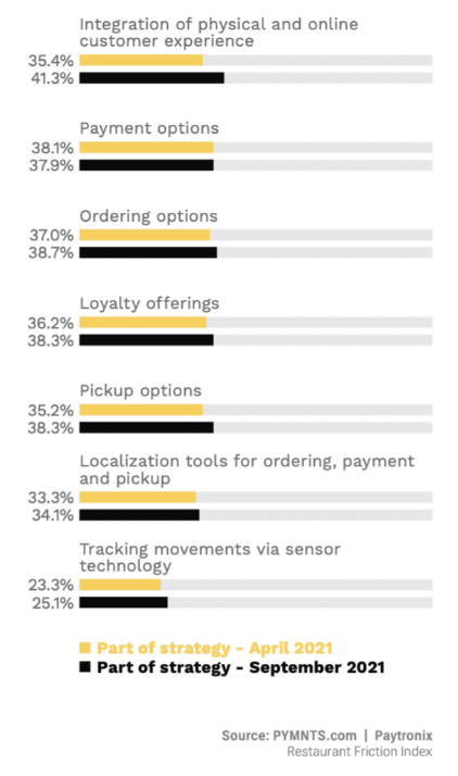 Otra de las preguntas realizadas en la pesquisa es la estrategia de innovación seguida por los restaurantes. La omnicanalidad cobra mayor importancia: se pasa de un 35.4 % a un 41.3 % de locales que entienden este paradigma como indispensable. Se dan otros crecimientos similares al hablar de multicanalidad, programas de recompensas y takeaway. Más del 38 % de los establecimientos apostarán por implementar cada una de ellas. Con más timidez siguen la traducción y localización lingüística de los servicios, y la sensórica para trazabilidad; respectivamente, un 34.1 % y un 25.1 % de los encuestados están interesados en estas. Por el contrario, hay una ligera caída en la importancia de la diversidad de opciones de pago.