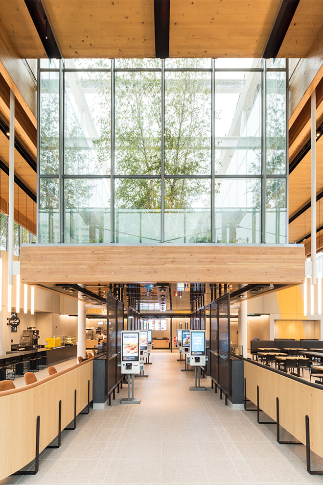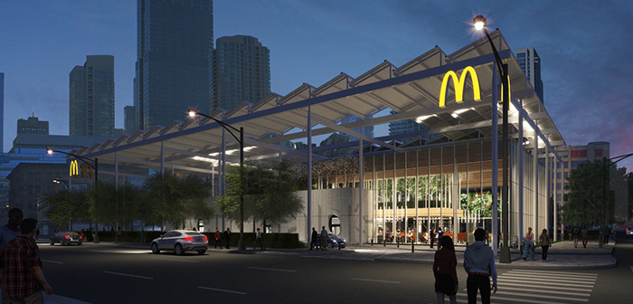 Pues bien, son varias las soluciones subyacentes que ya están presentes en el McDonald’s EotF de Chicago. Una de las más aparentes es la fachada acristalada y los espacios amplios y diáfanos que facilitan el tránsito por el interior del establecimiento.