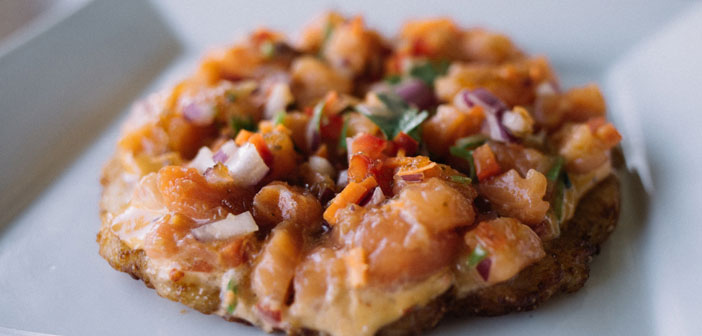 A continuación Vy añade una capa de mayonesa, generalmente picante, junto con atún marinado al ajonjolí o salmón, vegetales cortados en trocitos muy pequeños y un poco de color con cebolletas verde y cilantro, como todo buen plato foodie de hoy en día, que no falte el cilantro cayendo en el último momento.