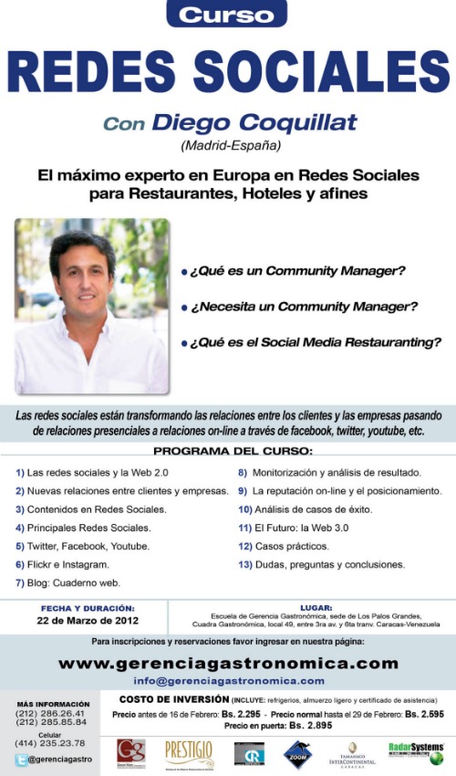 Pero hoy quiero compartir con todos vosotros una noticia que me hace especial ilusión, ya que cada vez tengo más seguidores en Latinoamérica, y es que el próximo día 22 de Marzo cruzaré el Atlántico para dar una conferencia-taller en Caracas (Venezuela) sobre como aprovechar el potencial de las redes sociales para empresas, en especial restaurantes, hoteles y empresas de turismo.