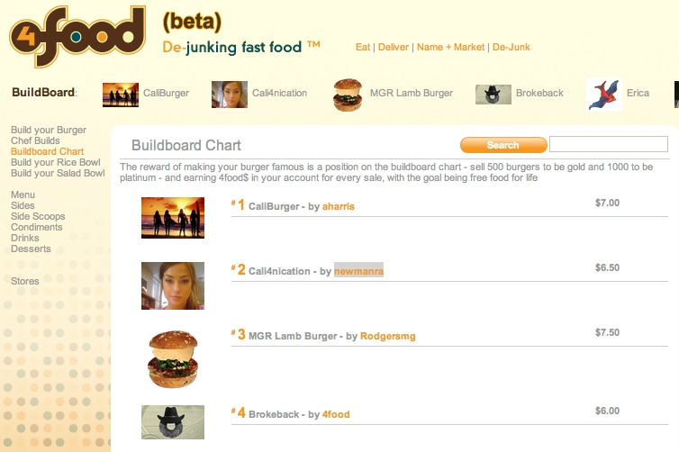 Por otra parte los clientes pueden realizar combinaciones con los diferentes ingredientes que oferta el restaurante en la tienda online que tiene en su web. Poner nombre a sus creaciones y difundirlas a través de la redes sociales principalmente twitter, facebook y foursquare. Los platos más exitosos serán premiados con bonos que podrán ser canjeados por comida en el restaurante.