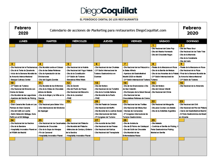 Febrero de 2020: calendario de acciones de marketing para restaurantes     Descarga en el #ClubDiegoCoquillat