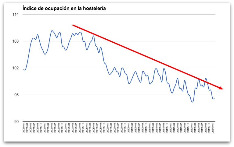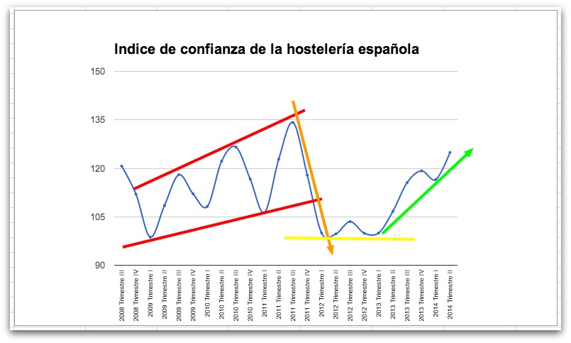 Es a partir del la mitad del 2013 cuando la curva cambia su dirección y comienza una tendencia alcista (flecha verde), en la cual nos encontramos inmersos en este momento, que me lleva a concluir con un cambio importante, en los últimos meses, en la percepción del hostelero sobre el futuro de su negocio.