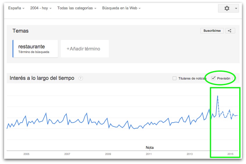 Las predicciones de Google Trend para lo que queda de este año y para el 2015 son buenas, ya que se mantiene la tendencia creciente en la búsqueda de la palabra «restaurante» en España como se puede ver en el siguiente gráfico: