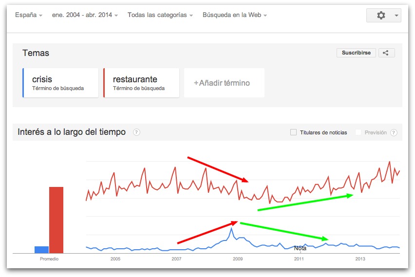 Además se da un elemento muy curioso y que demuestra la gran influencia psicológica de esta crisis, y es que existe una correlación negativa en los incrementos de las búsquedas de las palabras «crisis» y «restaurante», es decir, que a medida que aumenta una disminuye la otra y viceversa.