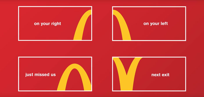 Como si se tratase de una señal de tráfico, los carteles invitan a los conductores a tomar un desvío, dar media vuelta o girar en la siguiente bocacalle. Este mensaje viene reforzado con un breve texto en fuente clara y legible que ahonda sobre la intencionalidad de los arcos estratégicamente colocados: «a tu derecha», «a tu izquierda», «salida 322», «acabas de pasar de largo»… Se está guiando a los conductores al establecimiento más cercano de la franquicia.