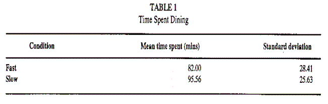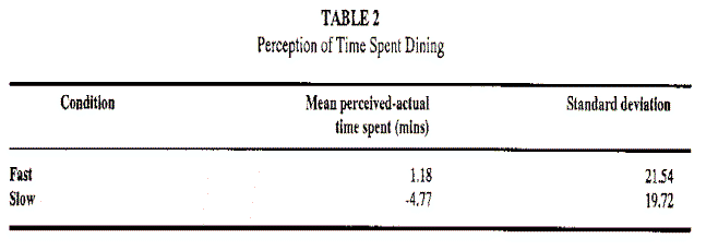 Se realizó una comparación entre el tiempo real que pasaron y la percepción que tuvieron del mismo los clientes. Los resultados muestran que en promedio los clientes que cenaron con música lenta subestimaron el tiempo empleado en el restaurante, mientras que los que cenaron bajo unas condiciones de música rápida sobreestimaron el tiempo pasado, lo que indica que la hipótesis es aceptada y el ritmo o tempo de la música afecta a la percepción del tiempo de los clientes mientras está en el restaurante.