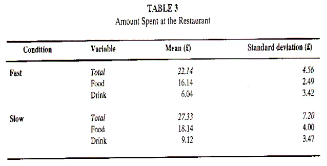 El estudio concluyó que el dinero promedio gastado con un ritmo de música alto fue de 22’14 £ (16’14 £ en comida y 6’04 £ en bebida) y con un ritmo lento 27’33 £ (18’14 £ en comida y 9’12 £ en bebida). El promedio global fue de 24’82 £ (17’17 £ en comida y 7’63 £ en bebidas).