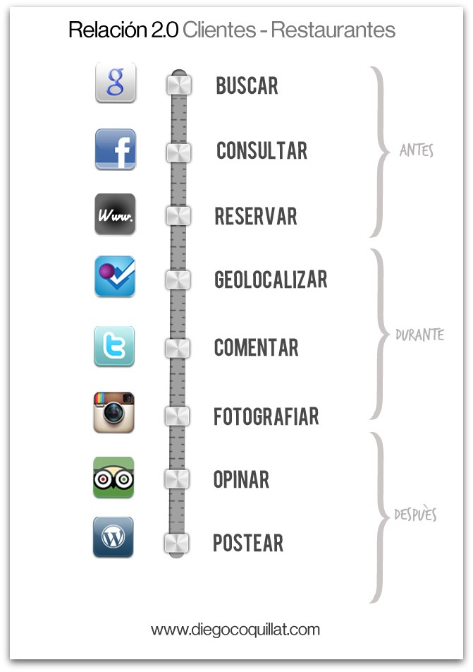 Por ello he querido sintetizar en una linea de tiempo esa transformación a través de las diferentes acciones online que en algunas de las principales redes sociales el cliente puede realizar a lo largo de su relación con el restaurante.