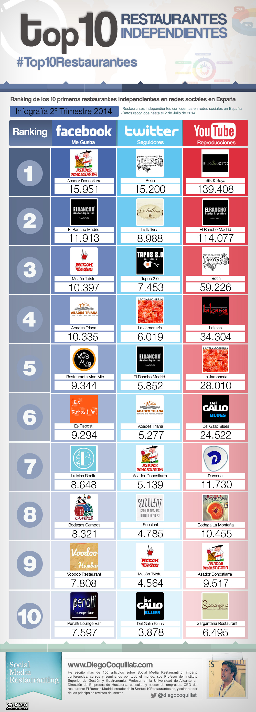 Finalizo la trilogía de infografías con el #Top10Restaurantes2T, los 10 restaurantes independientes más populares en las principales redes sociales en España en el segundo trimestre del 2014.
