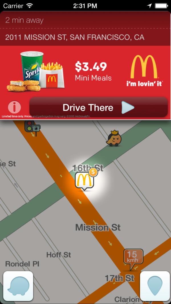 McDonalds fue una de las primeras en subirse al carro. Liz Woods, supervisora de medios de comunicación de H&L Partners, empresa de mercadotecnia y publicidad global que ha realizado la campaña de anuncios en mapas para McDonalds, indicaba: «A medida que las diferencias entre los medios tradicionales y digitales se diluyen cada vez más, Waze le brinda a McDonald’s la capacidad de combinar datos inteligentes y orientación con lo que de otro modo sería publicidad exterior de amplio alcance. La información que hemos capturado para nuestro cliente ha proporcionado un conocimiento más profundo sobre el rendimiento creativo, diurno, conductual del consumidor y geográfico«.