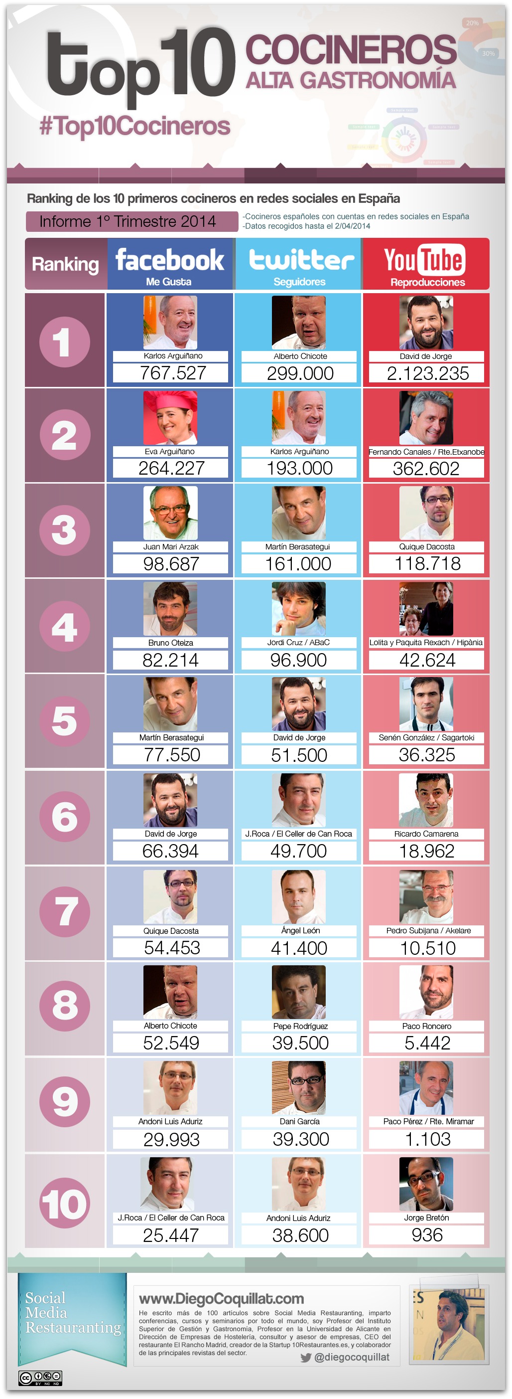 Siguiendo con la publicación de los Top10, hoy comparto con todos mis lectores el #Top10Cocineros, el ranking de los mejores cocineros en redes sociales en España en el primer trimestre del 2014.