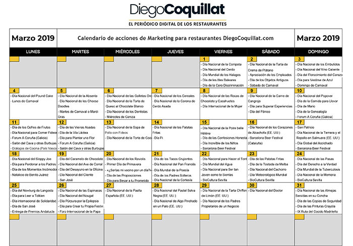Marzo de 2019: calendario de acciones de marketing para restaurantes   Descarga en el #ClubDiegoCoquillat