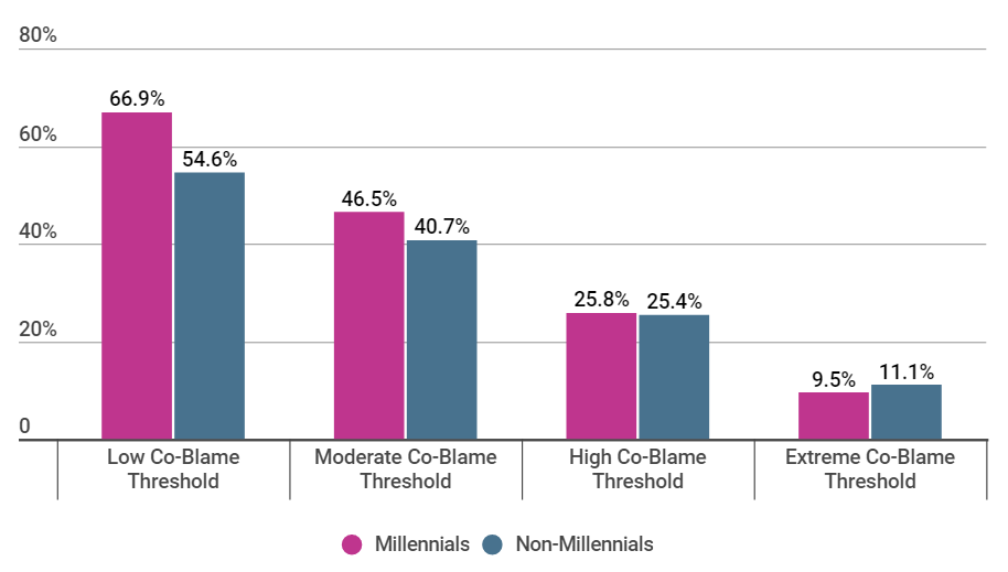 Las diferencias en la respuesta también se relacionan con la cohorte de personas con la que se trate. En el segmento demográfico asignado a los millennials, el descontento hacia todos los implicados aparece rápidamente, pero generalmente lo hace de forma no muy marcada. Así, mientras que el 66.9% de los millennials culpan cautelosamente de los problemas tanto a restaurante como a reparto, frente al 54.6% en generaciones mayores, las respuestas extremas son un 16.84% más habituales entre aquellos consumidores que superan los 39 años.