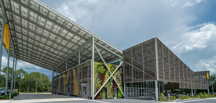 Este último ejemplo lo podemos observar en el local recién reformado en el lago Buena Vista (Florida, EE. UU.), al oeste del parque de atracciones de Disney. Se trata de un establecimiento fuertemente enfocado al drive-thru que además cuenta con una terraza y salón interior. El edificio se ha remodelado expresamente para ser el estandarte verde de la compañía y además de contar con una gran explanada para aparcar, también dispone de unas paredes diáfanas rematadas en madera que dan la sensación de apertura y frescor que tanto se necesita en esta zona de clima subtropical. Además, los listones que forman una celosía recuerdan métodos arquitectónicos tradicionales, más conectados con el uso sostenible de los recursos naturales.