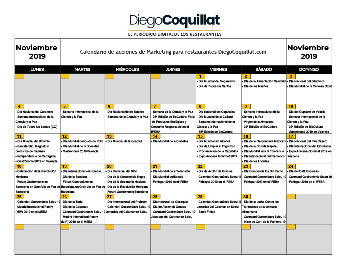 Noviembre de 2019: calendario de acciones de marketing para restaurantes Descarga en el #ClubDiegoCoquillat
