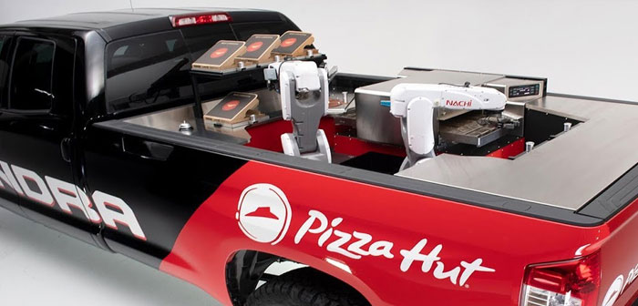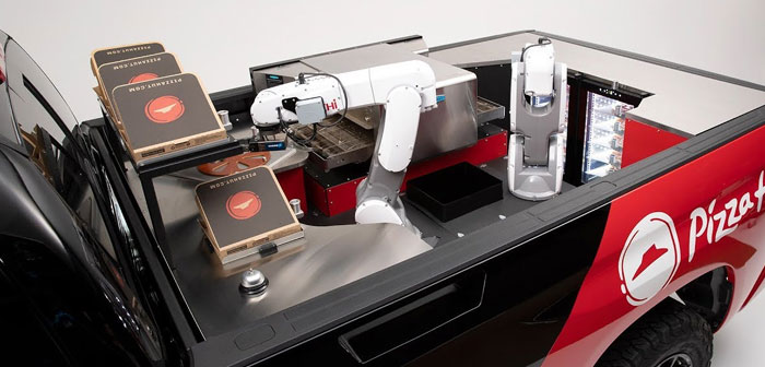 Lo harán mediante un nuevo vehículo que permitirá entregar las sabrosas pizzas en tiempo récord. El pick-up diseñado por el fabricante de coches porta en su caja todo el equipo necesario para crear la pizza solicitada por el cliente durante el tránsito: brazos robóticos de cocina, hornos, armarios protegidos para los ingredientes, etc.