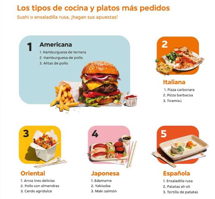 - Un 62 % de los pedidos se concentran de 20:00 a 23:00, el 25 % de 13:00 a 16:00, el resto se reparte entre desayunos (5 %) y meriendas (8 %)