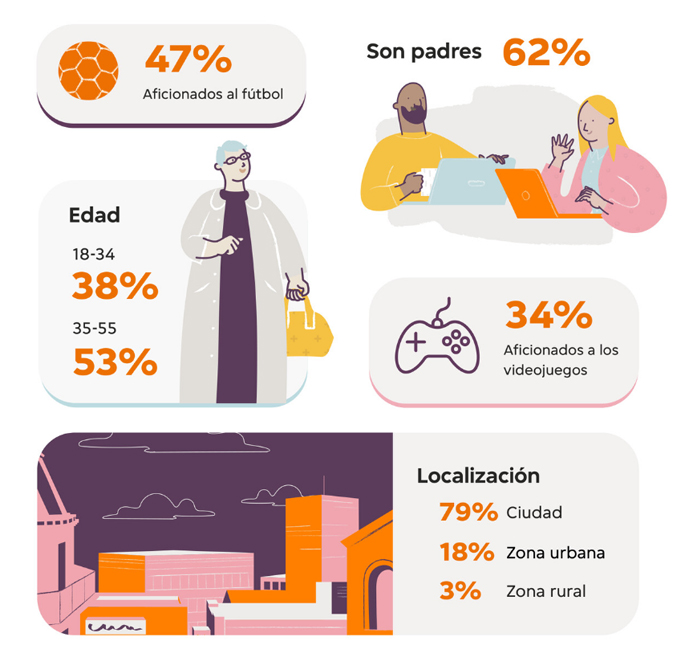 - El 47 % son aficionados al fútbol, mientras que el 34 % son gamers