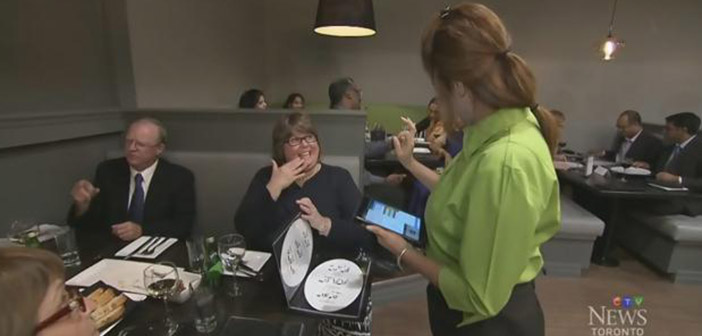 En Toronto existe la posibilidad de acudir a Signs, un restaurante en el que todos los camareros son sordos y en el que nos animan a iniciarnos, o seguir practicando, el lenguaje para sordos. Aquí el plato del día lo pides con señas, mediante el lenguaje para sordos americano. Puedes pensar que con señalar el plato que deseas al camarero, todos sordos, lograrías tu objetivo pero se trata de empatizar y vivir la experiencia completa. Es por ello que en la carta, junto a cada alimento, hay iconos o dibujos de personas que te indican cómo pedir cada plato. Además de aparecer otros trucos para comunicarte con los camareros, darles tu opinión sobre el plato o indicarle tus posibles alergias. Incluso en la pared hay cuadros en los que se ve a una persona haciendo un gesto del lenguaje para sordos y debajo la bebida que significa. Aquí la carta habla por sí misma, el lenguaje de signos.