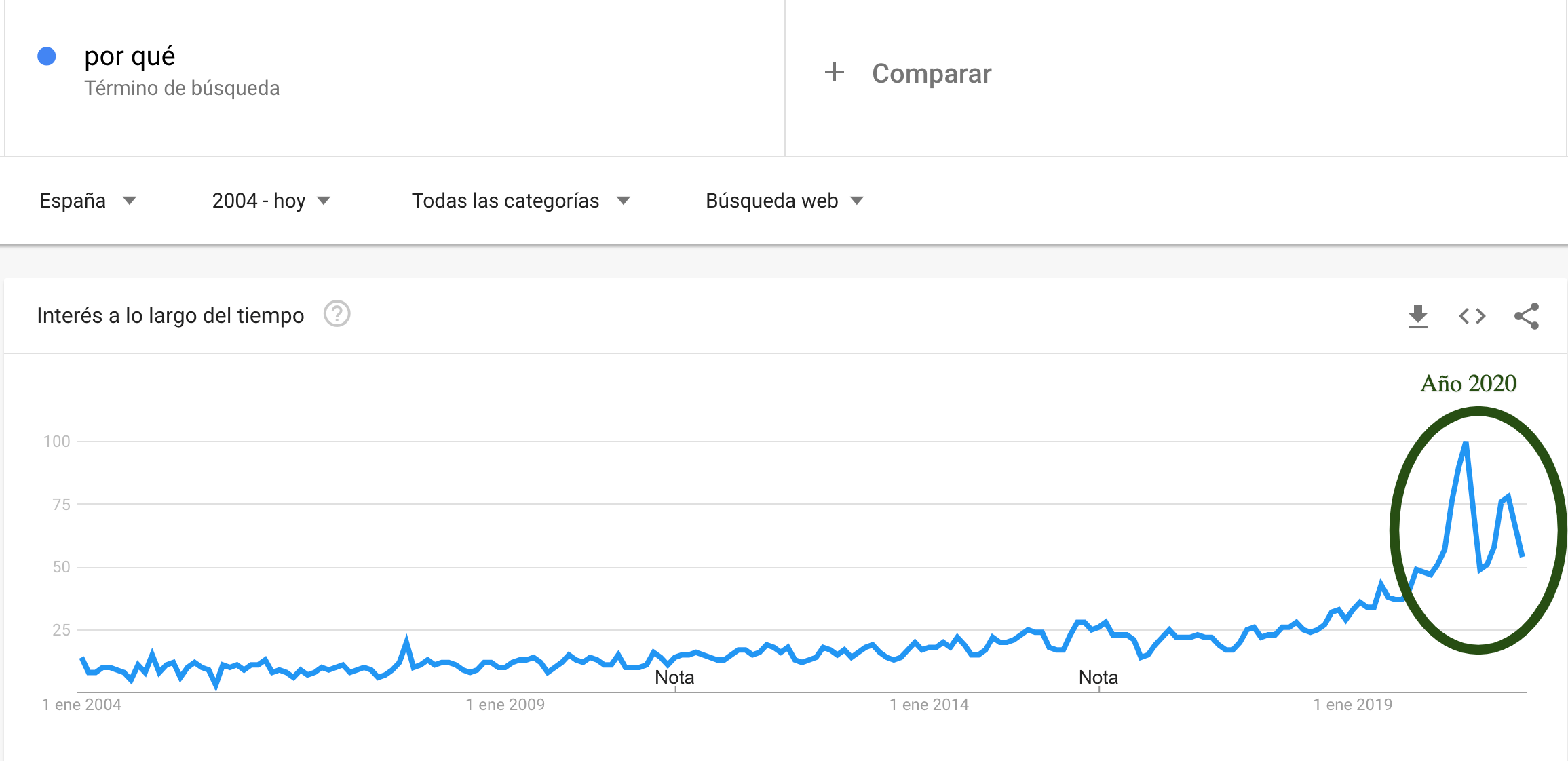 Si comparamos las búsquedas en España durante los últimos 15 años del término «por qué», vemos en el siguiente gráfico cómo ha habido un crecimiento absolutamente exponencial en el año 2020.