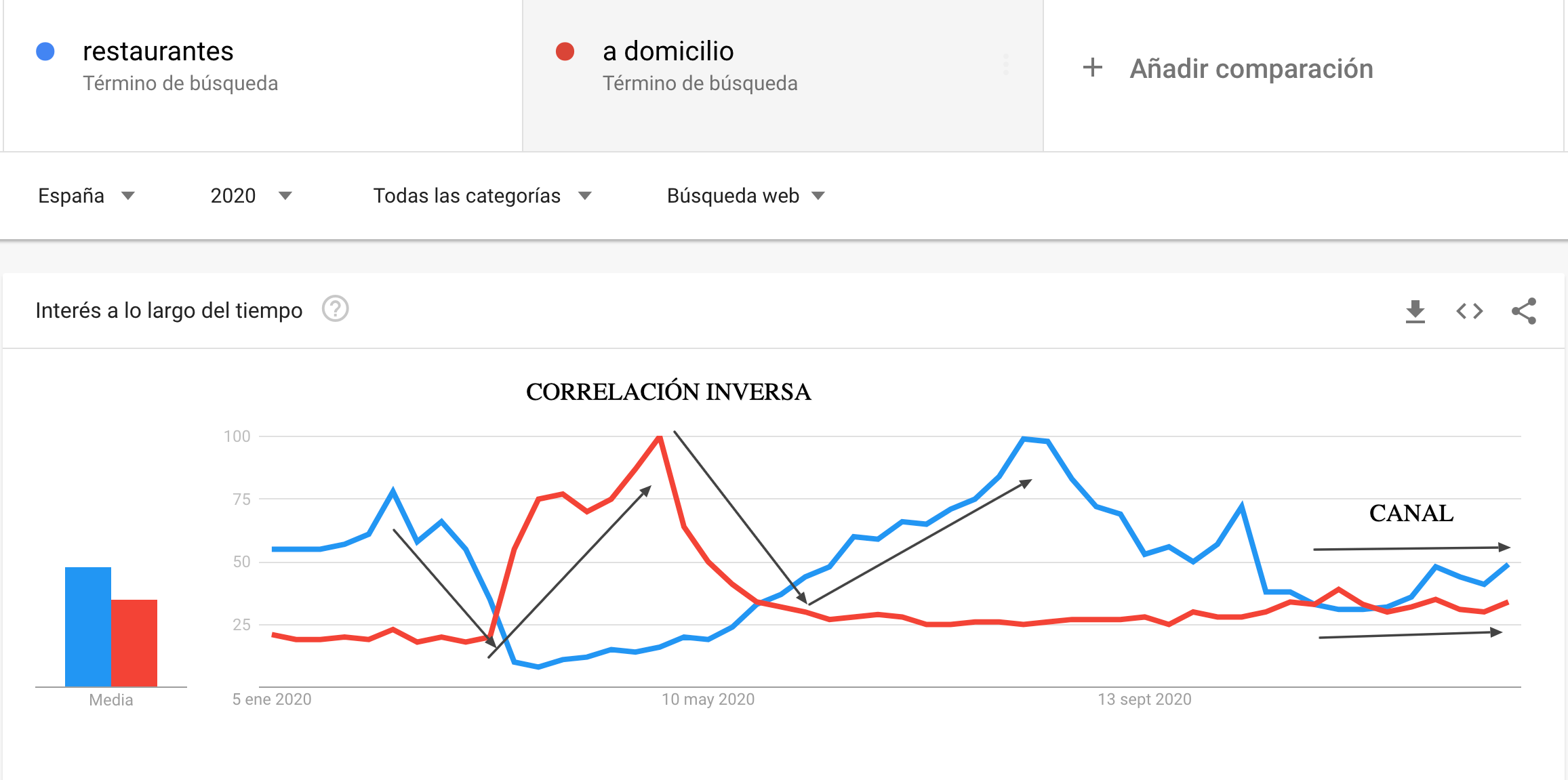Si analizamos las búsquedas de los términos genéricos, encontramos que hay una correlación inversa entre la presencialidad en los restaurantes y la comida a domicilio, lo que demuestra que durante una buena parte del año algunos clientes han sustituido acudir a los restaurantes por el delivery, e incluso clientes que nunca habían tenido experiencias en este servicio, han comenzado a utilizarlo, lógicamente motivado por las limitaciones gubernamentales sobre los primeros. En la parte final del año parece que la tendencia se mantiene en paralelo, entrando en un canal gráfico que valida la importancia de los dos modelos para los próximos meses, y que perdurará en los próximos años.