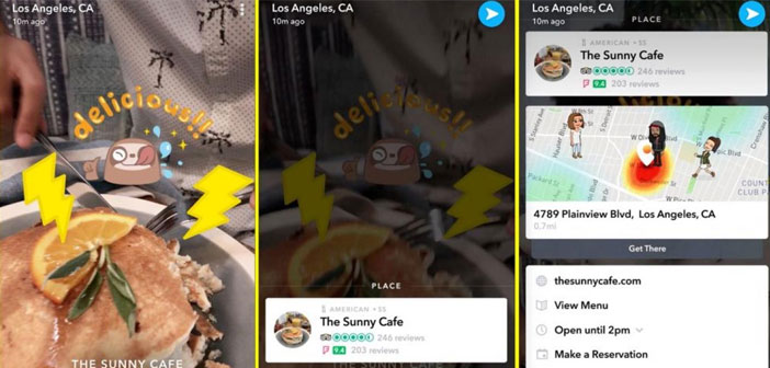 Esta innovación de Snapchat forma parte de su estrategia para potenciar la herramienta de geolocalización Snap Maps, en la que mediante un sistema de geolocalización, cualquier usuario puede buscar un restaurante o punto de interés que se encuentre cerca. Al encontrarlo tan solo habrá que seleccionarlo y deslizar para acceder a la información básica del lugar así como a una opción que permite hacer reseñas e incluso reservas.