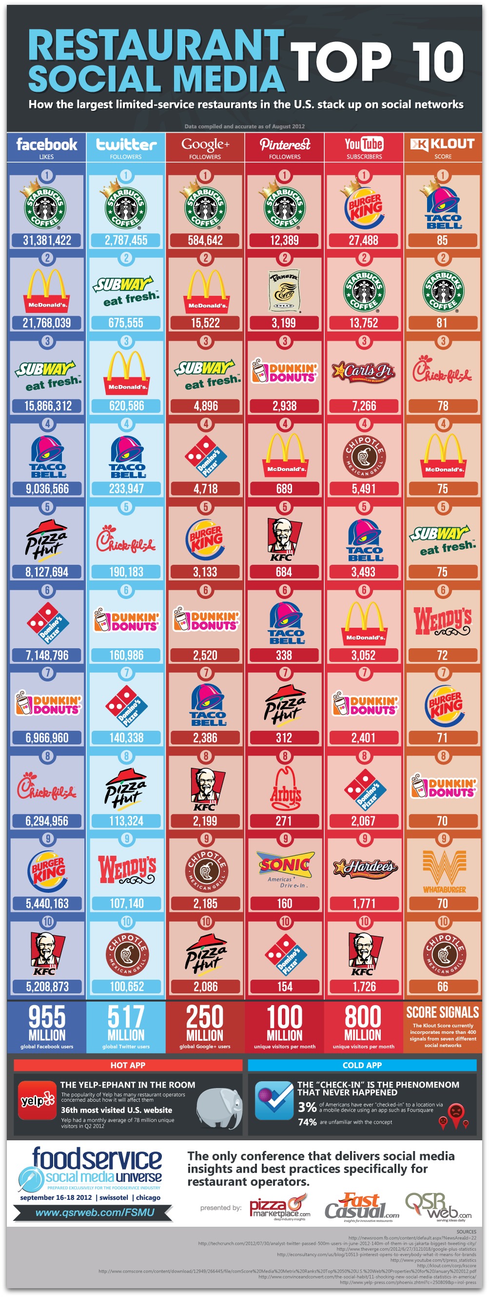 - Es indudable que la red social más utilizada entre el Top 10 de las cadenas de restaurantes en Estados Unidos es Facebook, con más de 100 millones de fans/likes, seguida por Twitter con algo más de 5 millones de seguidores, una diferencia muy importante.