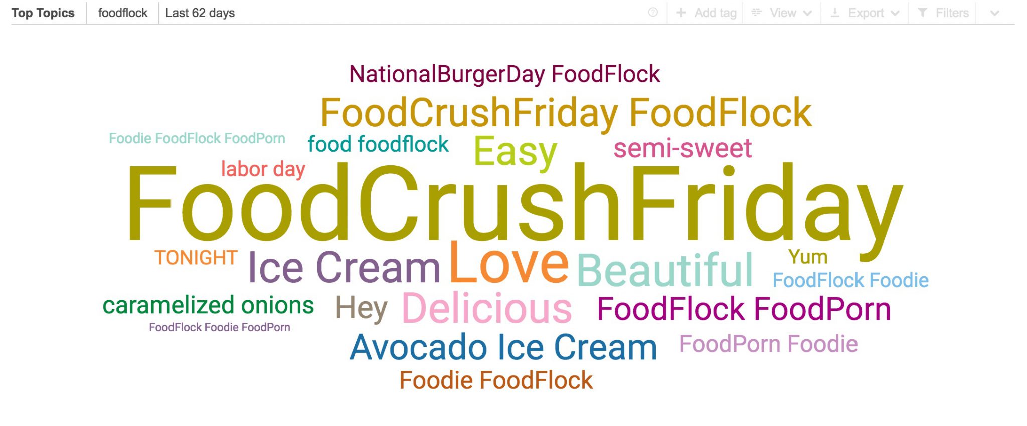 Los «topics» o términos relacionados con la etiqueta principal, hacen referencia en su mayoría al mundo Food o de los alimentos, destacando especialmente el hash #FoodCrushFriday